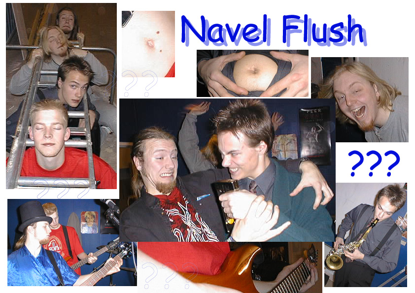 Band Profile - who are these guys anyway? Sounds - listen to us in mp3 format! Navel FAQ - Questions and Answers about the band Navel Notes - what's happening in Navel Land? Updated April 12 Lint Exchange - a tribute to our former members Ken's Jokes - lighten (?) your day up. Concert Shots (Henriette, summer 1998) Visit our Navel Forum at Deja News Join our fanclub : Stormtroopers of Flush A poster you can print out or use as your desktop pattern: poster.jpg (220k) Band contact / comments / suggestions: [email protected] or [email protected] |